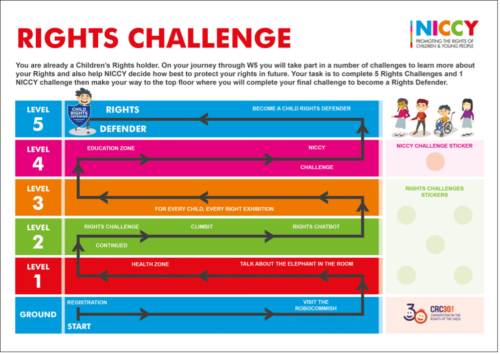 One of the projects I worked on was a celebration for the 30th anniversary of the UN Convention on the Rights of the Child (CRC). On 20 November 2019, NICCY was to host 1,500 children and young people from across Northern Ireland at W5, an interactive science and discovery centre. The day would be structured around a “Rights Challenge”, the completion of which would transform the participant from rights holder to rights defender. Children would move through the centre, first learning about human rights, then discussing them, and finally being certified as NICCY rights defenders (you can find more about the event, here).