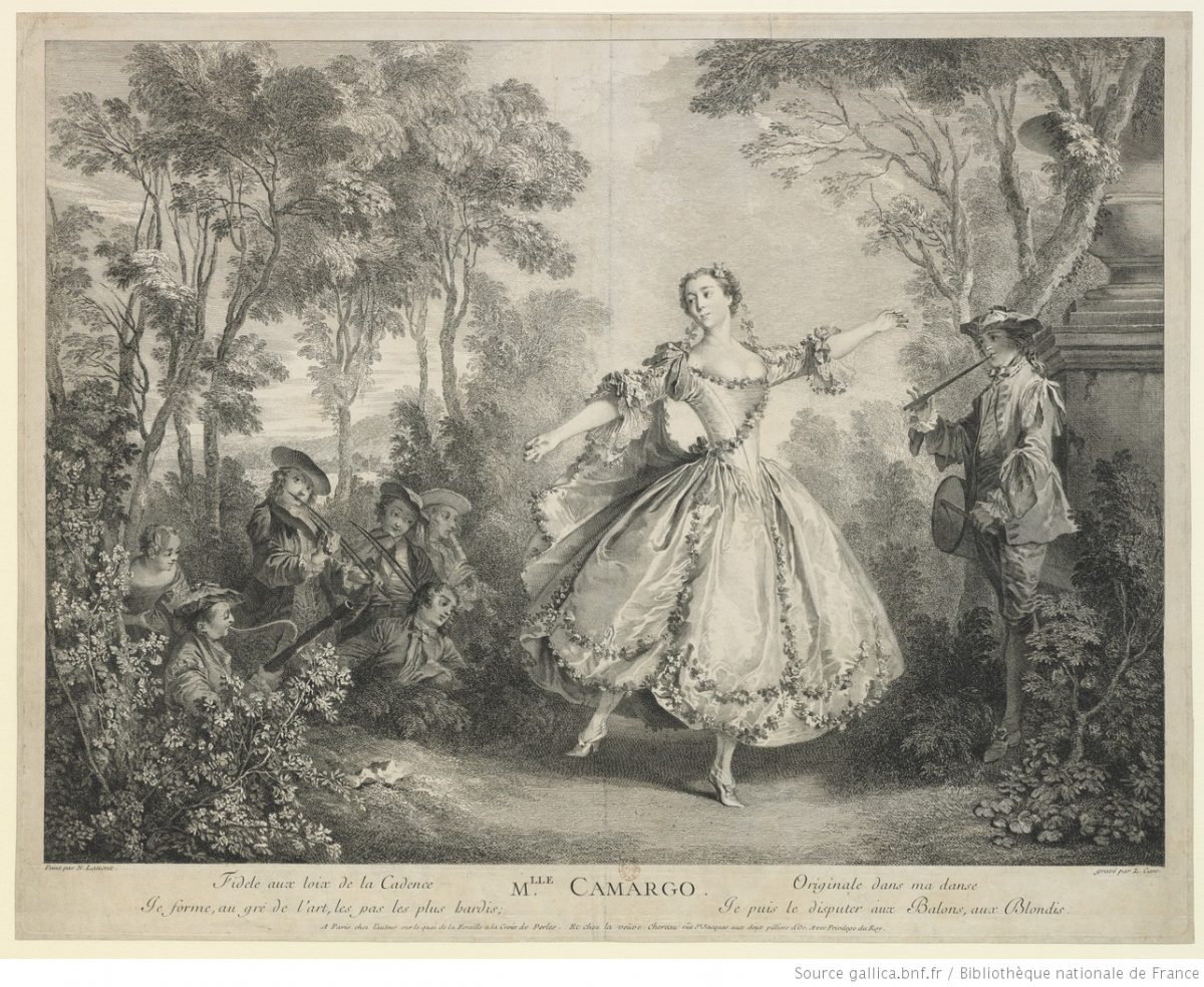 2. “Mademoiselle de Camargo, qu’une inspiration soudaine vint animer, quitte son rang, s’élance au milieu du théâtre, improvise le pas de Dumoulin, danse de verve et de caprice, et transporte d’admiration et d’enthousiasme les spectateurs.” Castile-Blaze (1832). La Danse et les ballets depuis Bacchus jusqu’à Mademoiselle Taglioni, reprinted by Hardpress, 2019.
