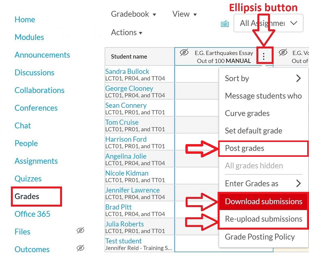 - Click 'Grades,' click the 'ellipsis button' (3 vertical dots) beside the 'assignment title,' then click 'download all submissions.' (this will download all student submissions for this assignment onto your computer.)