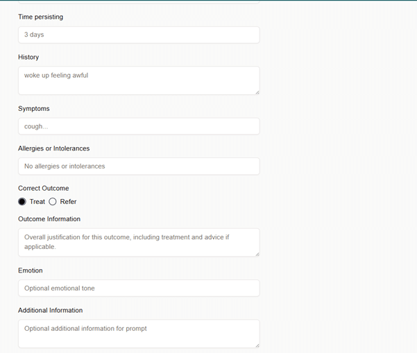 Further to this, it was crucial that QAIRx allowed students to make clinical decisions based on their interaction with a patient, and to receive immediate feedback on their selected outcome and the handling of the overall consultation, which again made use of provided parameters within the platform’s reference set. This closes the loop on the activity in a way which fully reflects the equivalent in-person activities and offers significant formative benefit. These needs, coupled with those related to the requirement to create a straightforward interface for both students and educators, led to the delivery of a comprehensive and challenging workplan that involved the development of frontend, backend, and GenAI solutions all of which have culminated in the platform which we use with students today. You’ll be able to see examples of key aspects of QAIRx below.