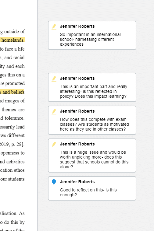 I used in-text comments to comment on specific sentences or paragraphs as I graded the piece of work. I asked questions to extend thinking and highlighted parts of the work which were good and which were linked to the rubric. These in-text comments were helpful to talk about specific sentences or to discuss the minutiae, but were not always an effective way to discuss the overall piece.