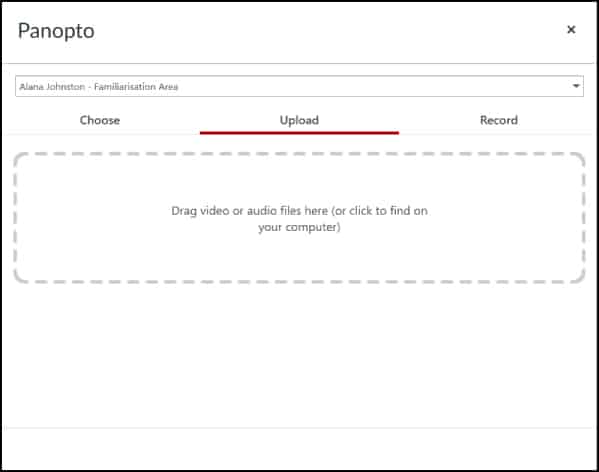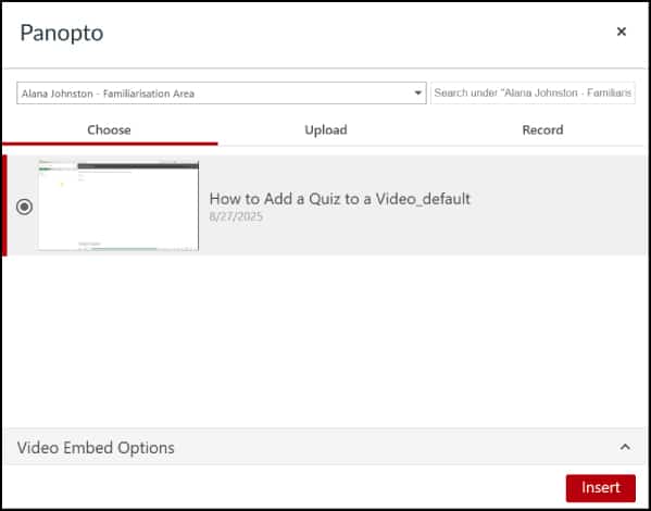 - Choose: Select a video which you’ve already created/uploaded to Panopto.