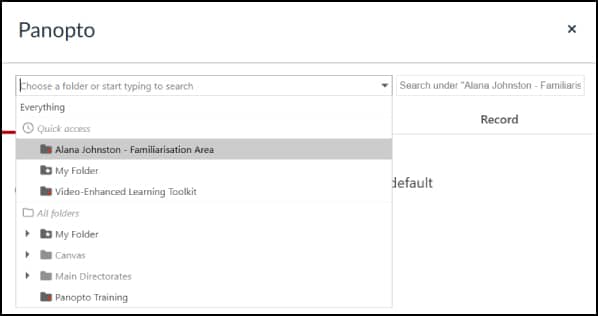 💡Tip: By default, when you embed a video in Canvas you’ll only see videos from the folder linked to that course. If you want to embed a video from another Panopto folder (for example, My Folder), use the drop-down menu to switch folders.