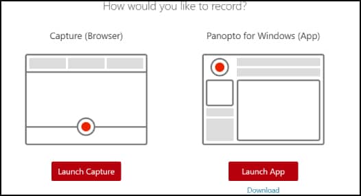 - Panopto App: Download required, best for more advanced recordings. Learn how to use the Panopto app here.