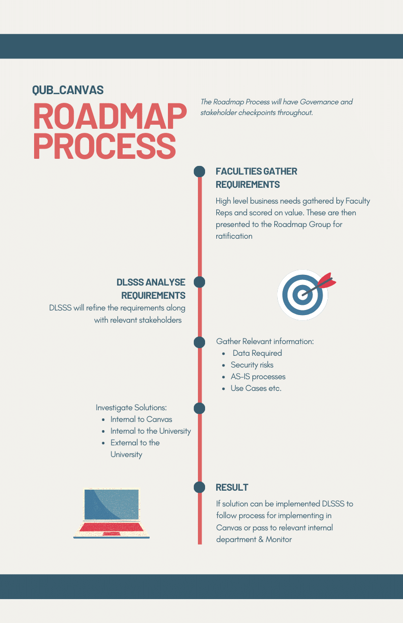 The QUB Roadmap process has been established to provide colleagues with an avenue to raise requirements (for Canvas) to support with Teaching, Learning and Assessment.