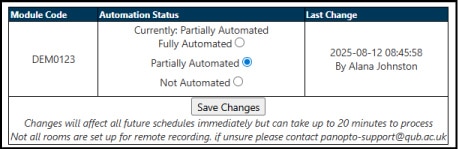 From 15th September 2025, lectures in centrally bookable teaching spaces will be recorded automatically using Panopto. By default, all lectures are set to record. The Automated Scheduling Tool on Queen’s Online brings your upcoming recordings together in one place and gives you full control to: