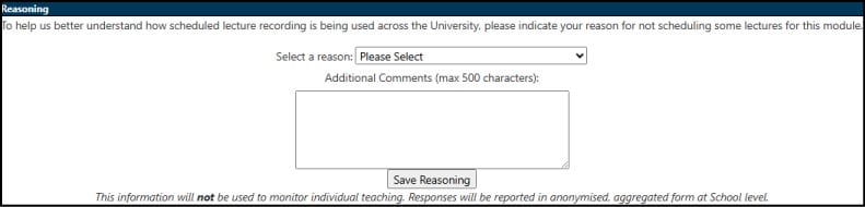 - Pedagogic reasons – e.g. teaching style or activity unsuitable for recording.
