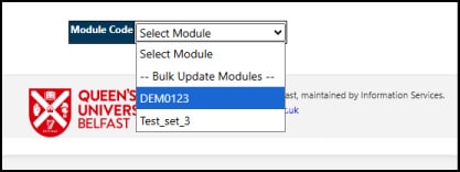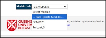 - Select Bulk Update Modules from the drop-down. If you don't see your modules listed, log into Panopto first (http://qub.cloud.panopto.eu/) and then return to the Scheduling Tool.