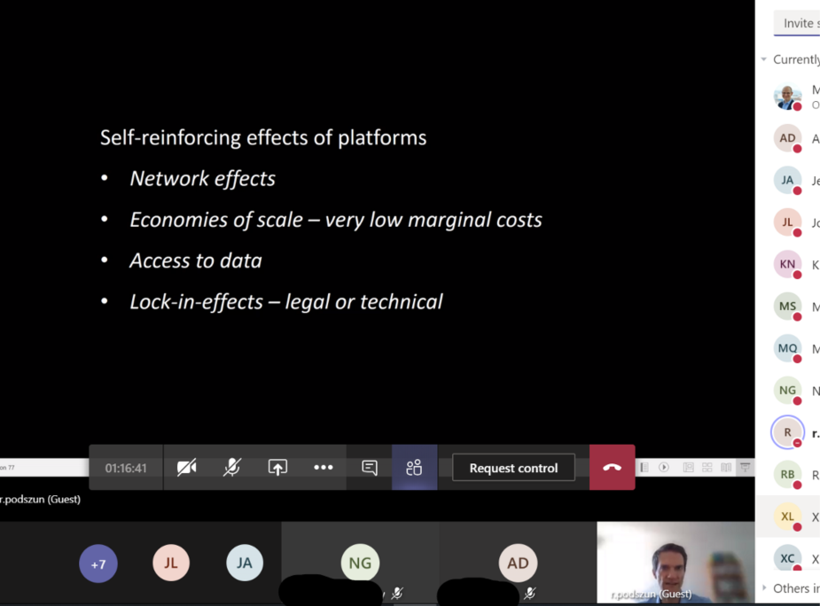 Yesterday we had a great pleasure to host a virtual guest lecture by Professor Rupprecht Podszun (Heinrich-Heine-Universität Düsseldorf) on Competition Law and Big Tech. Needless to say the focus was highly topical and the guest covered all the key perspectives/ dimensions, providing some excellent food for thought.
