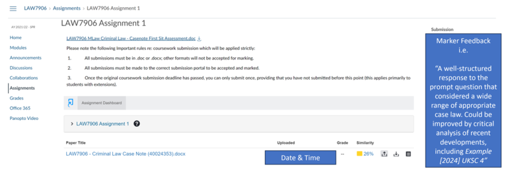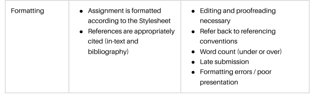 Assignment feedback often includes specific feedback related to the subject topic, alongside commentary on a student’s proficiency in various academic skills related to the assignment. These academic skills can include the use of secondary criticism, writing style and argument development, or assignment formatting.
