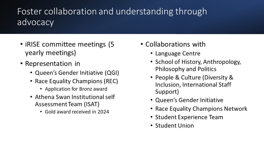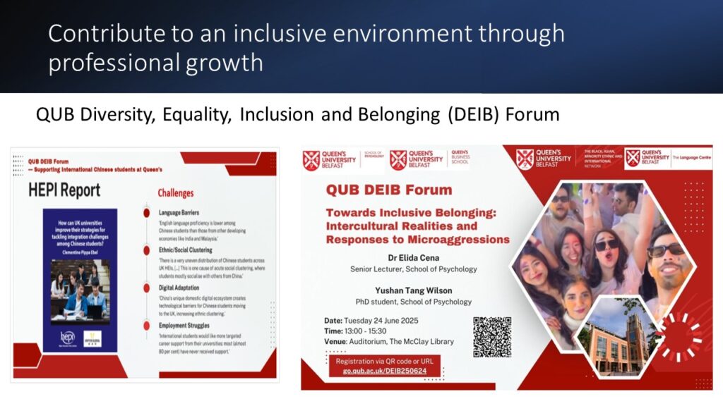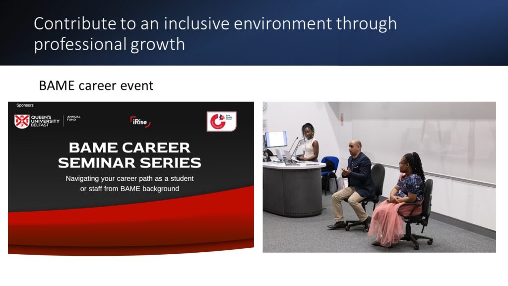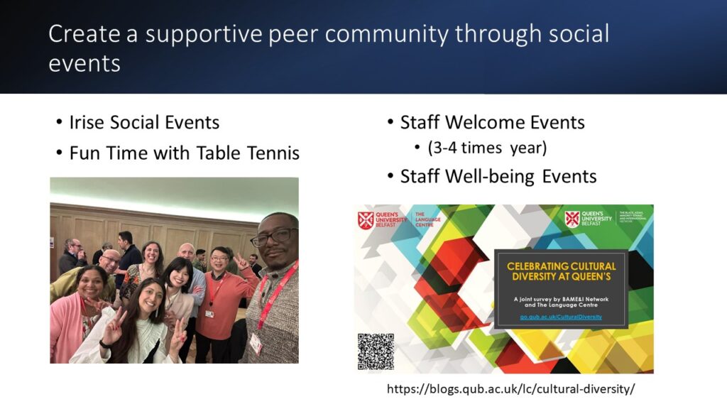 Following the brief introduction of QUB iRise Staff Network by the Committee members in presence (Gulseli, Eyad, Liang and Qingying), colleagues from academic and professional backgrounds shared stories of moving to Belfast, working at Queen’s, and building community through QUB iRise Staff Network.