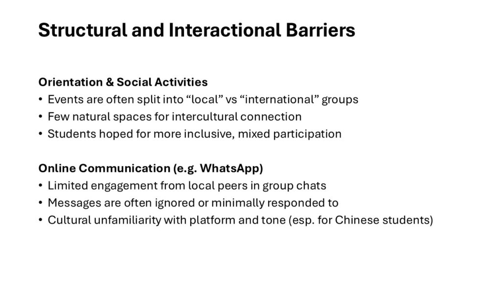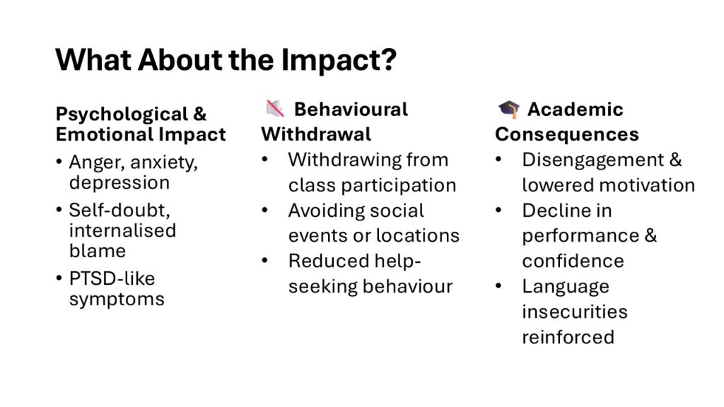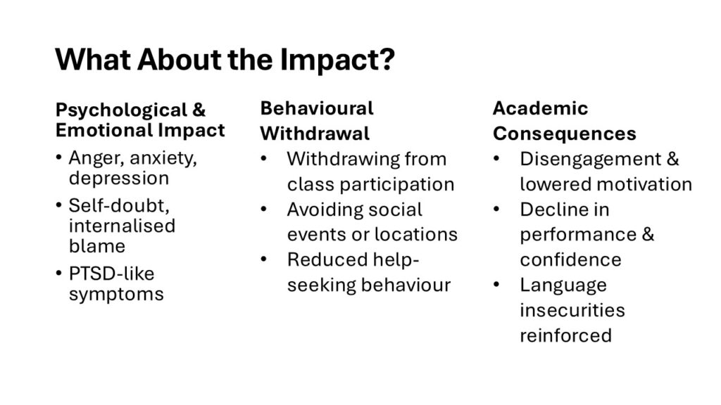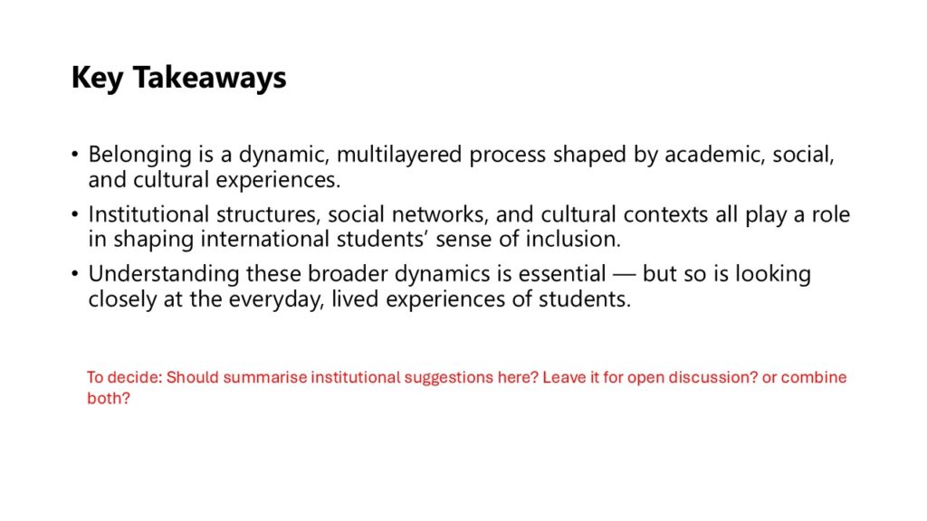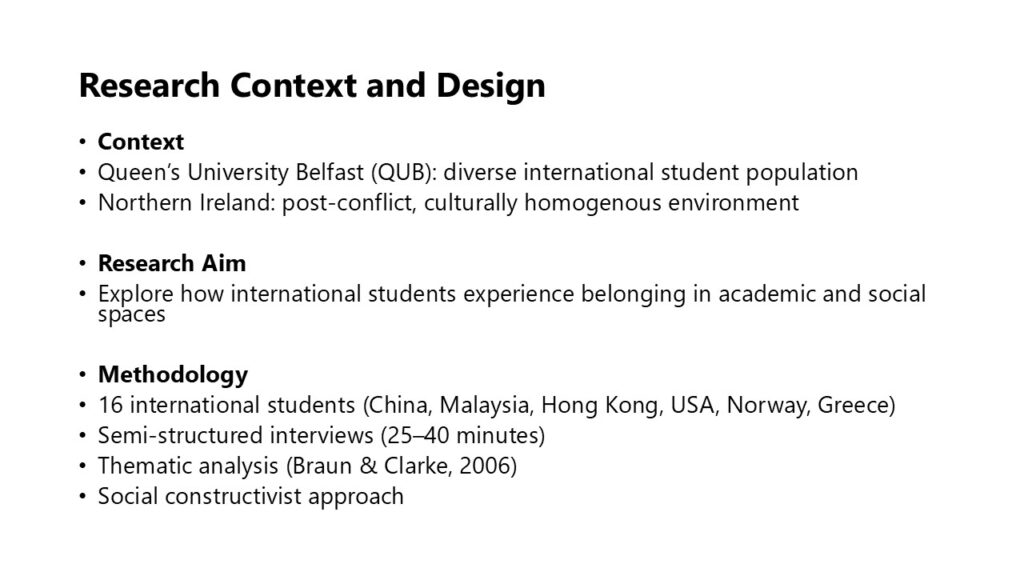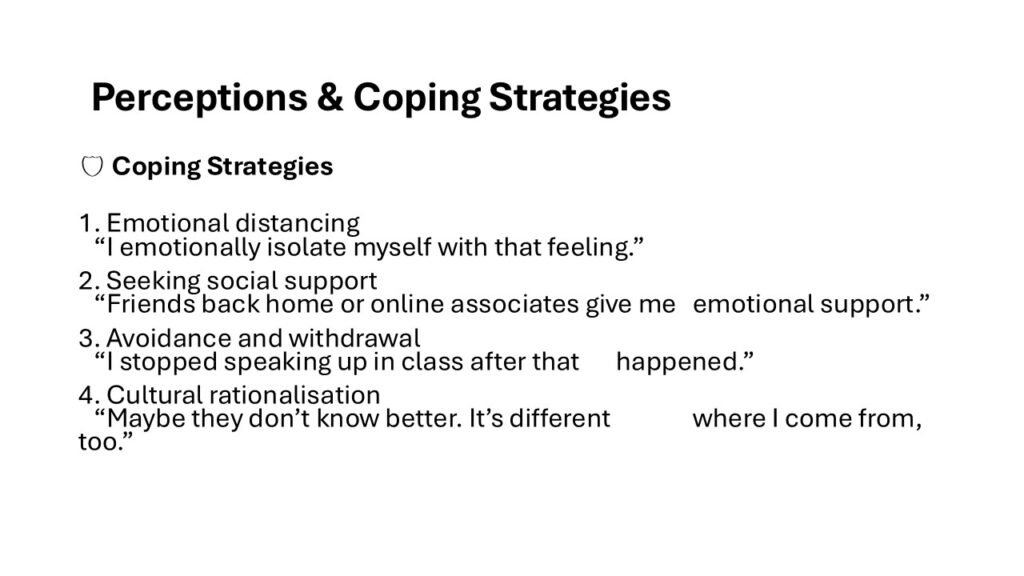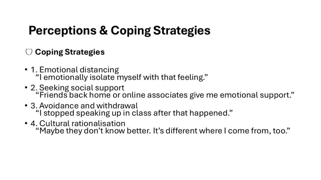 Led by Dr Elida Cena and her research student Yushan Tang Wilson from the School of Psychology, the session explored the lived experiences of Chinese and Indian students at Queen’s, examining how microaggressions and cultural dynamics shape their sense of inclusion and belonging within the university community.
