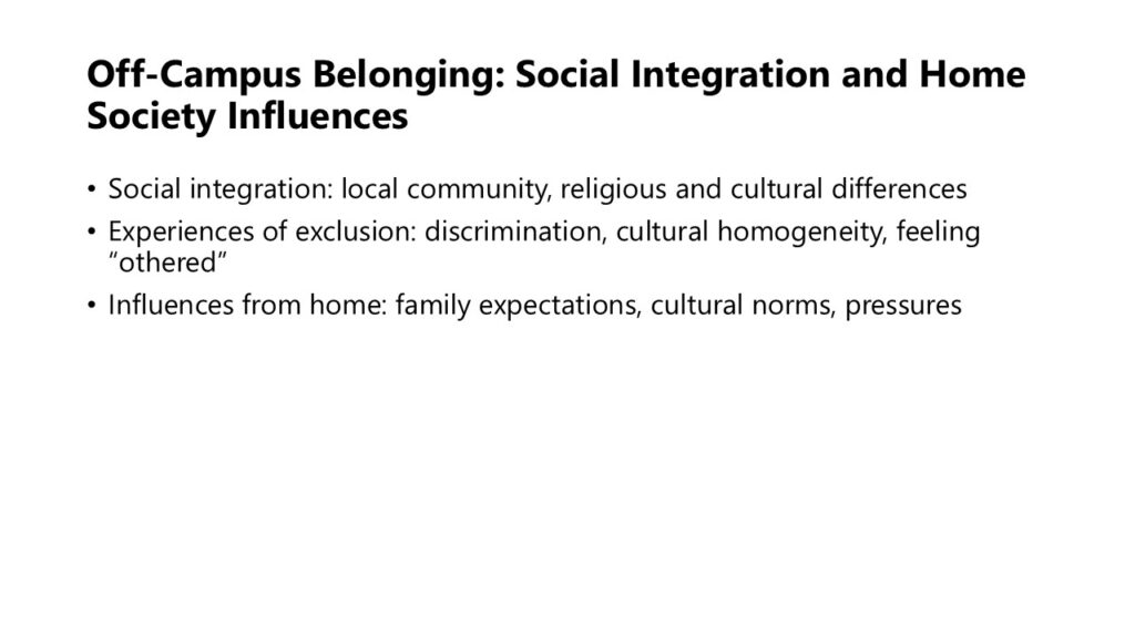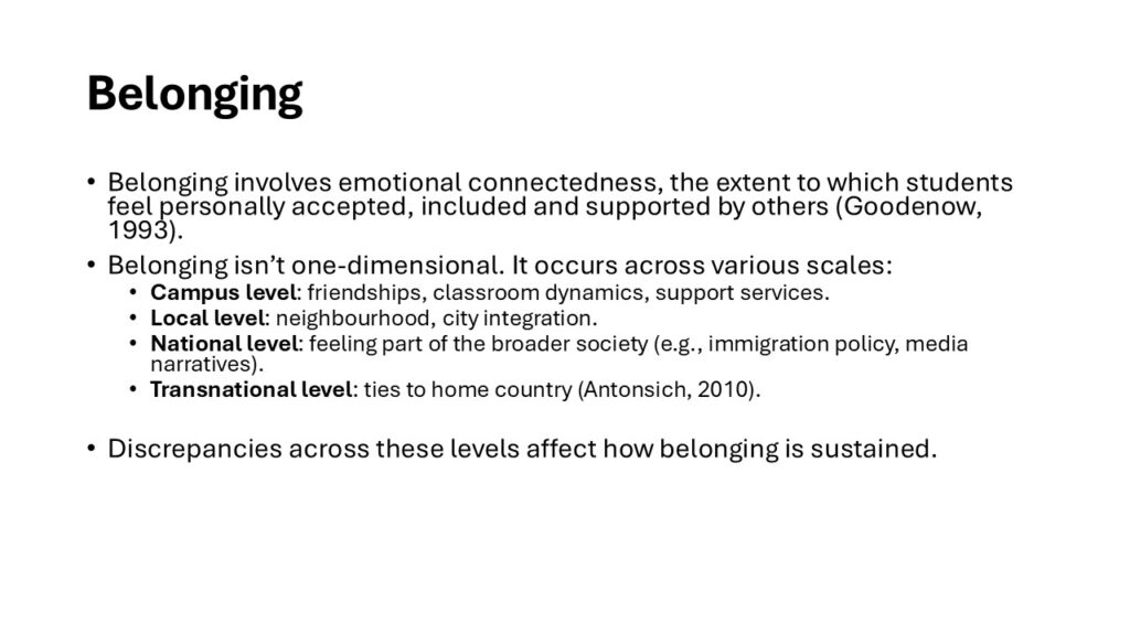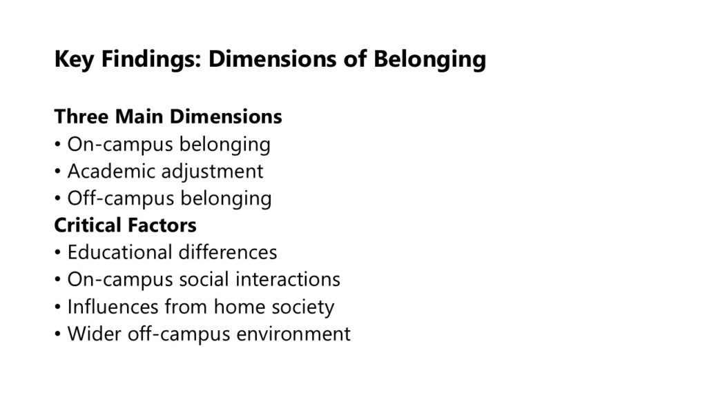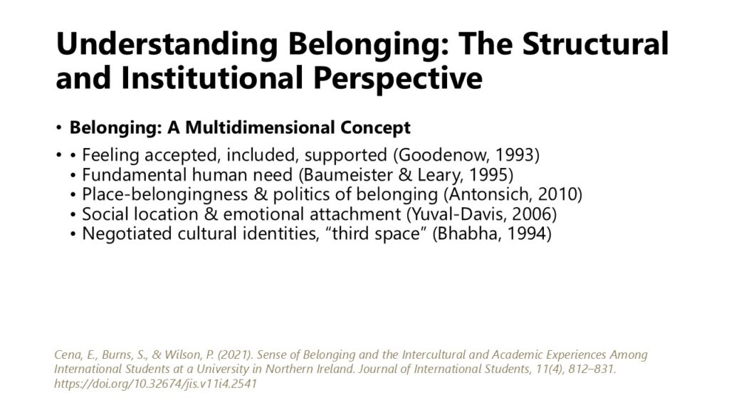 Cena, E., Burns, S., & Wilson, P. (2021). Sense of belonging, intercultural and academic experiences among international students at a University in Northern Ireland. Journal of International Students, 11(4), 812-831. https://doi.org/10.32674/jis.v11i4.2541