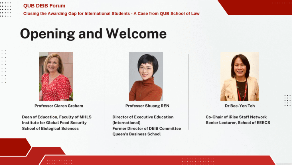 The third Diversity, Equity, Inclusion and Belonging (DEIB) Forum was held at Queen’s University Belfast with a focus on the awarding gap experienced by international students in the School of Law. Building on the success of the first two events, the Forum continued Queen’s commitment to strengthening equity and inclusion in teaching, learning and student experience.