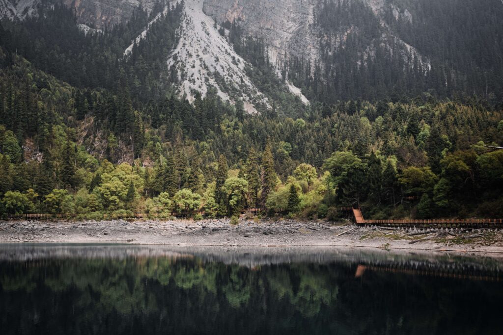 Photographed in Jiuzhaigou, Sichuan, 2022. A still lake reflects the forested slope and rock face above, while a wooden walkway runs along the shoreline. The image captures the coexistence of protected landscape and built access, along with the damp, quiet atmosphere after rain.