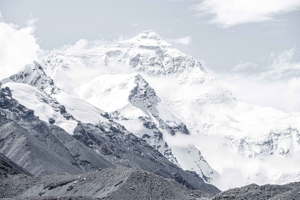 Photographed at Mount Everest in Tibet, 2018. Under high-altitude light, the snowline and rock faces appear in sharp layers, while clouds drift slowly across the slopes. The image records the mountain’s terrain and scale in shifting winter conditions.