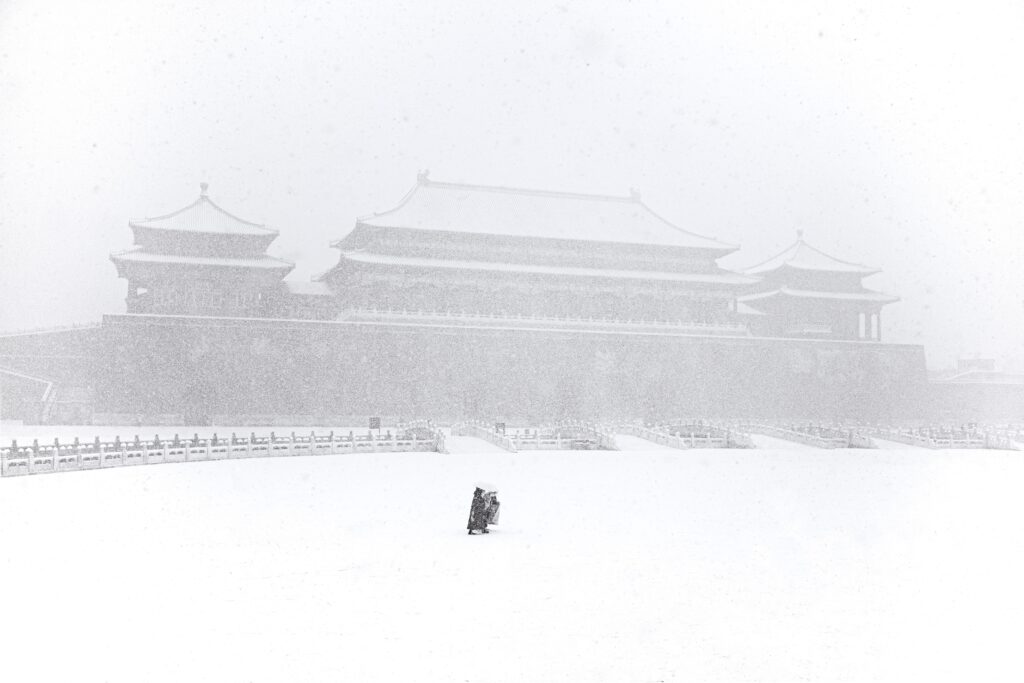 Photographed at the Forbidden City, Beijing, 2025. Heavy snow covers the open square and steps, while the palace structures fade into the snowfall. At the centre, a lone figure crosses the white ground, emphasising the scale and stillness of the scene.