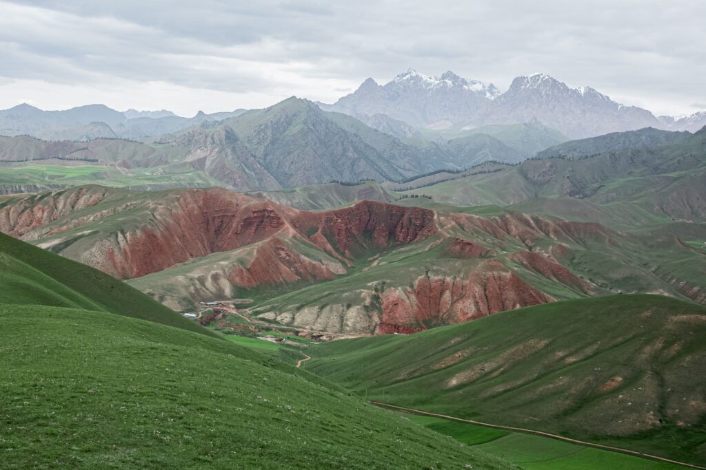 Photographed in Gansu, 2022. Rolling grass slopes lead towards red ridges in the distance, while snow-capped peaks appear beneath a low cloud cover. The image records the meeting of contrasting landforms within a single landscape, highlighting the depth and openness of China’s north-western highlands.