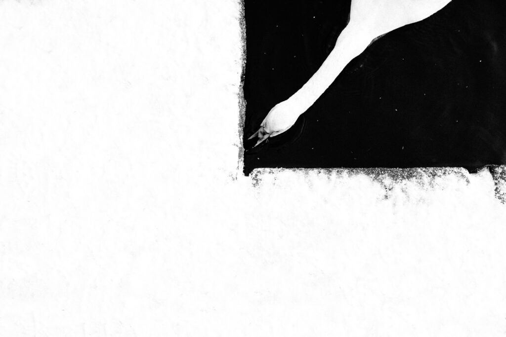 Photographed at the Old Summer Palace (Yuanmingyuan), Beijing, on 2 January 2020. Just after the New Year, the snow-covered bank contrasts sharply with the dark water in the upper right. A swan extends its long neck from the water towards the snowy edge, capturing a quiet, fleeting moment by the winter lake.