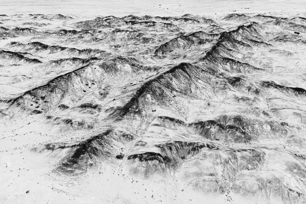 Photographed in Qinghai, 2023. The plateau surface forms a continuous pattern of ridges and folds shaped by wind, snow, and arid conditions, with light and shadow revealing the rhythm of the terrain. Viewed from the air, the vast landscape becomes almost abstract, emphasising scale and structure.