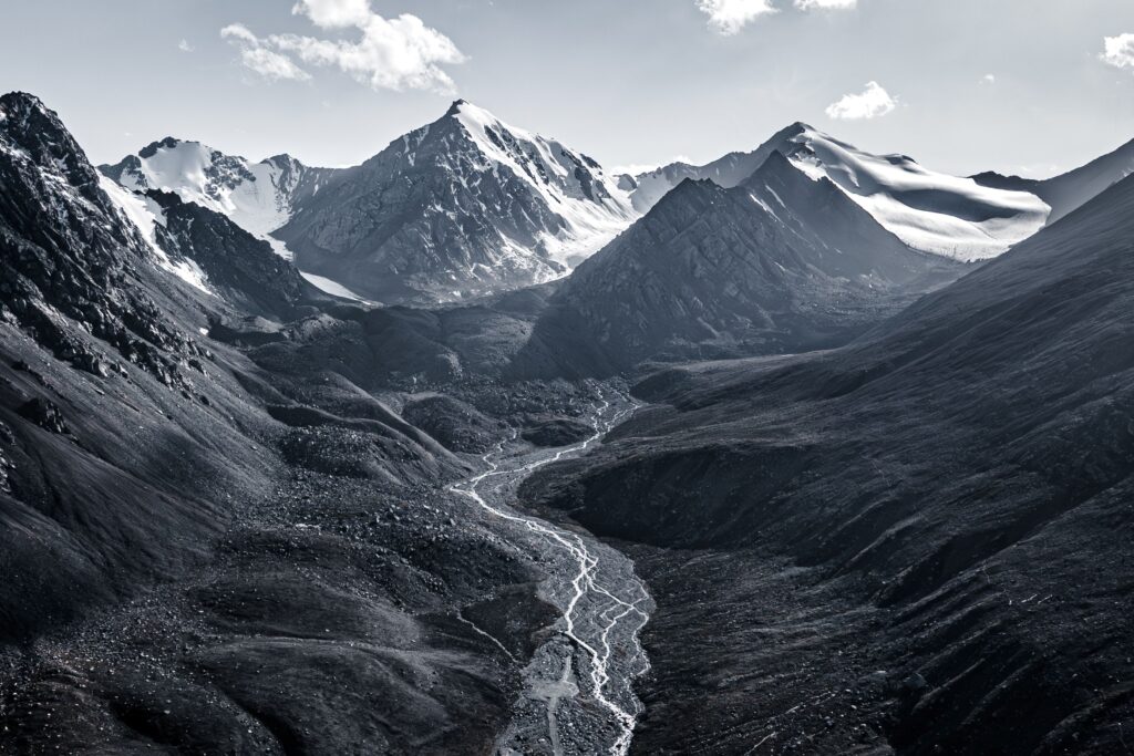 Photographed at Baersi Mountain in Zhangye, Gansu Province, 2020. Snow remains along the ridgelines, while the darker slopes reveal the mountain’s exposed surface. Meltwater runs downhill and threads through the valley floor, tracing the shift between winter and the coming thaw.