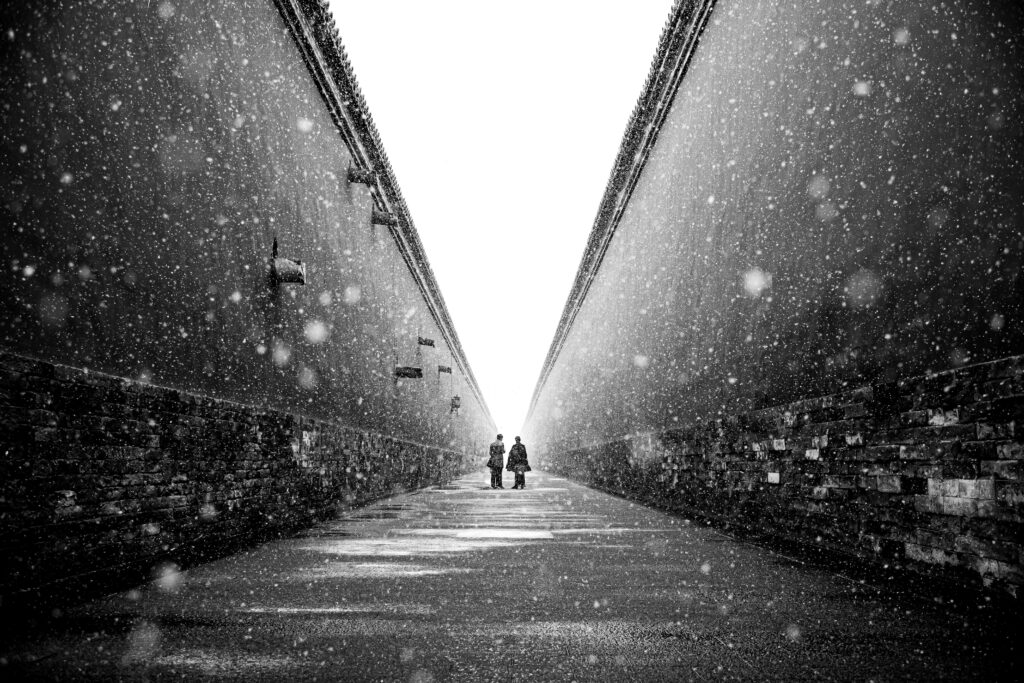 Photographed at the Forbidden City, Beijing, 2025. In heavy snowfall, the palace walls create a long, narrow passage, with snow and footprints breaking up the ground. Two visitors walk side by side in the distance, appearing small against the scale of the walls and the storm.