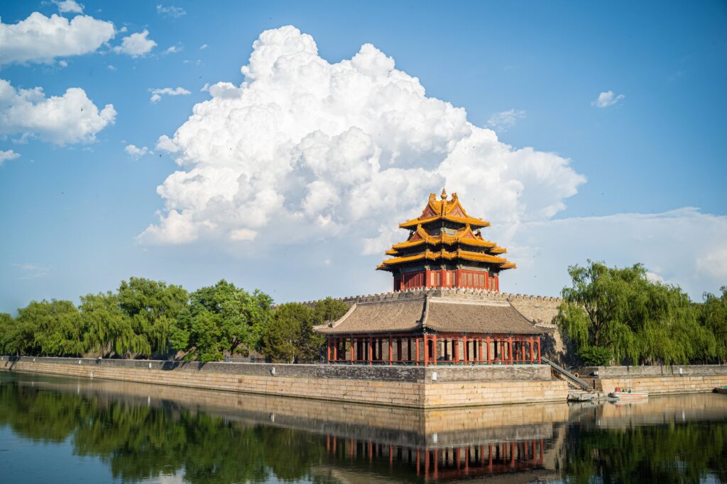 Photographed at the corner tower of the Forbidden City, Beijing, 2023. The moat is still, reflecting the tower and the city wall, while large cumulus clouds fill the sky above. The image captures the light and structure of the Forbidden City’s outer landscape on a summer afternoon.
