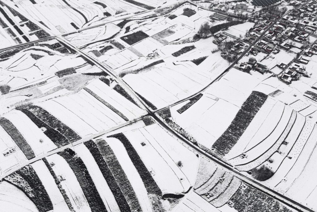 Photographed in a farmland area in Gansu Province, 2022. Snow covers the fields, while roads cut across the landscape and divide the farmland and nearby village into clear geometric sections. The scene highlights the patterns and organisation of rural land in winter.