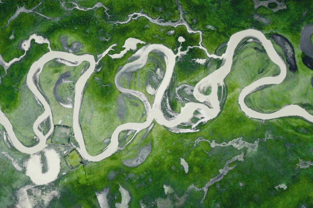 Photographed at Awancang Wetland, Gansu, 2022. The river winds repeatedly through the marshland, with pale water channels cutting across dense green vegetation. Seen from the air, the image highlights the wetland’s water system and the textures shaped by seasonal water levels.