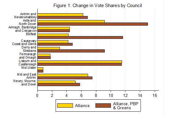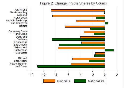 The gains made by the smaller parties came at the expense of unionist and nationalist parties. Figure 2 shows the largest losses by unionist parties were in councils where the Alliance picked up the most support (with further losses to the Greens in Belfast as well). While the DUP managed to increase its first-preference vote share, the decline in the broader unionist vote will undoubtedly continue discussions about divisions among unionist parties given demographic trends with potential to reduce these parties’ vote shares further.
