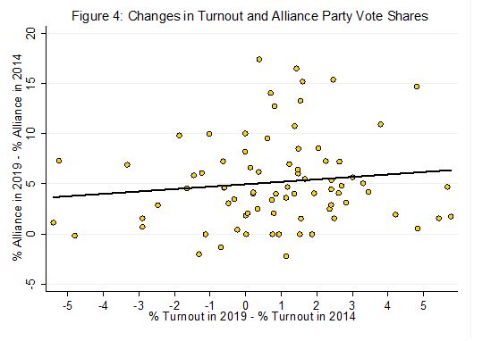 However, analysing the relationship between changes in turnout and changes in party support provides little evidence to suggest that the gains made by the Alliance were due to changes in turnout. Figure 4 shows that changes in vote shares for the Alliance Party were unrelated in any systematic way to changes in turnout. (Similar findings emerge when looking at the Green Party’s vote shares.) Though the Alliance Party saw its vote shares increase in some DEAs where turnout increased, the party’s vote shares also increased in DEAs where 2019 turnout was lower than in 2014.