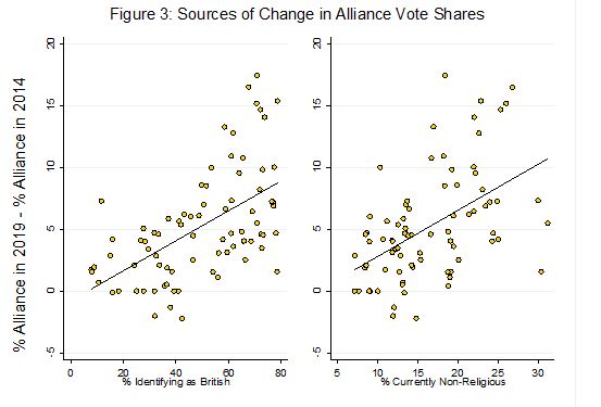 More importantly, Figure 4 shows that the increases in turnout were exceeded by the increases in the party’s vote shares. Even if we assume every voter reflected in the increased percentage turning out in 2019 voted for the Alliance Party as their first preference (a difficult but not impossible proposition), the fact the increased vote shares for the Alliance Party exceeded the increases in turnout means that other voters who turned out in 2014 switched their first-preference votes to the Alliance Party in 2019. Keeping in mind that the party fared better in DEAs with more non-religious voters and voters identifying as British, this implies that many voters supporting unionist parties in 2014 switched to support the Alliance Party.