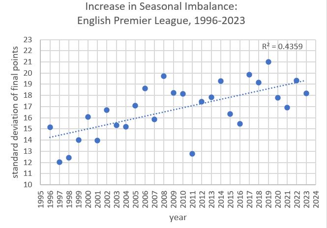 What this increase over time in the standard deviation shows is that the Premier League is becoming more imbalanced, with increasingly large differences between the good teams and the poor teams. This increase in imbalance indicates a clear decline in competitiveness in the Premier League.