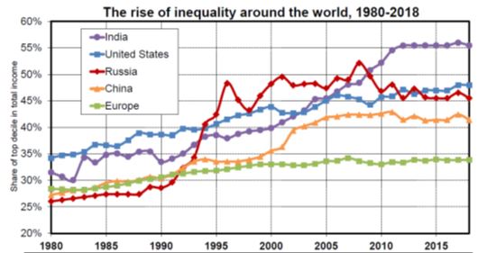 Interpretation. The share of the top decile (the 10% highest incomes) in total national income ranged between 26% and 34% in 1980 in the different parts of the world and from 34% and 56% in 2018. Inequality increased everywhere, but the size of the increase varies greatly from country to country, at all levels of development. For example, it was greater in the United States than in Europe (enlarged EU, 540 million inhabitants), and greater in India than in China. Sources and series: see www.piketty.pse.ens.fr/ideology (figure 0.3). Slide by Thomas Pickety.
