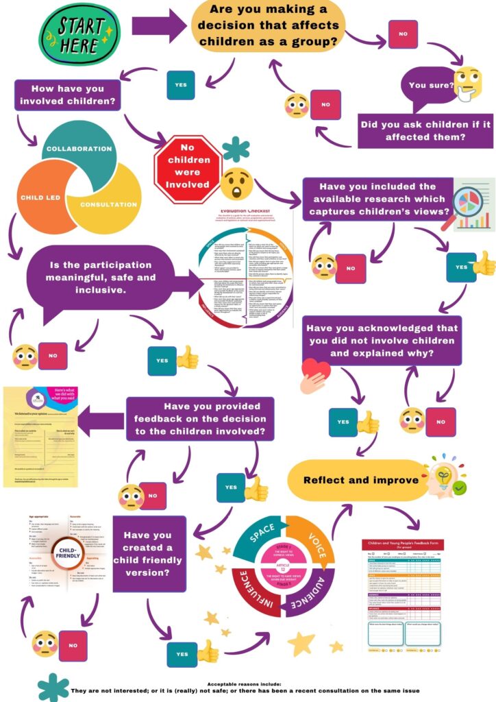 The very first decision is whether to involve children at all and that’s not even really a ‘decision’ as opposed to a ‘duty’ if it is a matter that affects them. Children have a right to be included in all matters affecting them and the best way to find out whether that is the case is to ask them: a seemingly obvious but frequently ignored first step. The reality is that there are few decisions that do not affect children at all so the trajectory should usually then proceed to seeking their views. However, there are some exceptions which I note – the children do not want to be involved (e.g. no interest, no time); there has been recent engagement on the same issue; and, in rare instances, it is not safe for children to be involved. However, all too often the reality is that children are often not involved because it does not suit adults, who sometimes use the excuse of ‘tokenism’ as an excuse for what is, in effect, a denial of a human right (see Lundy, 2018).