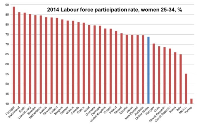 For one, the US has one of the lowest rates of labour force participation among women of prime childbearing age in the OECD. See chart below. That’s a lot of unused potential that could be increasing family incomes and driving up economic growth.