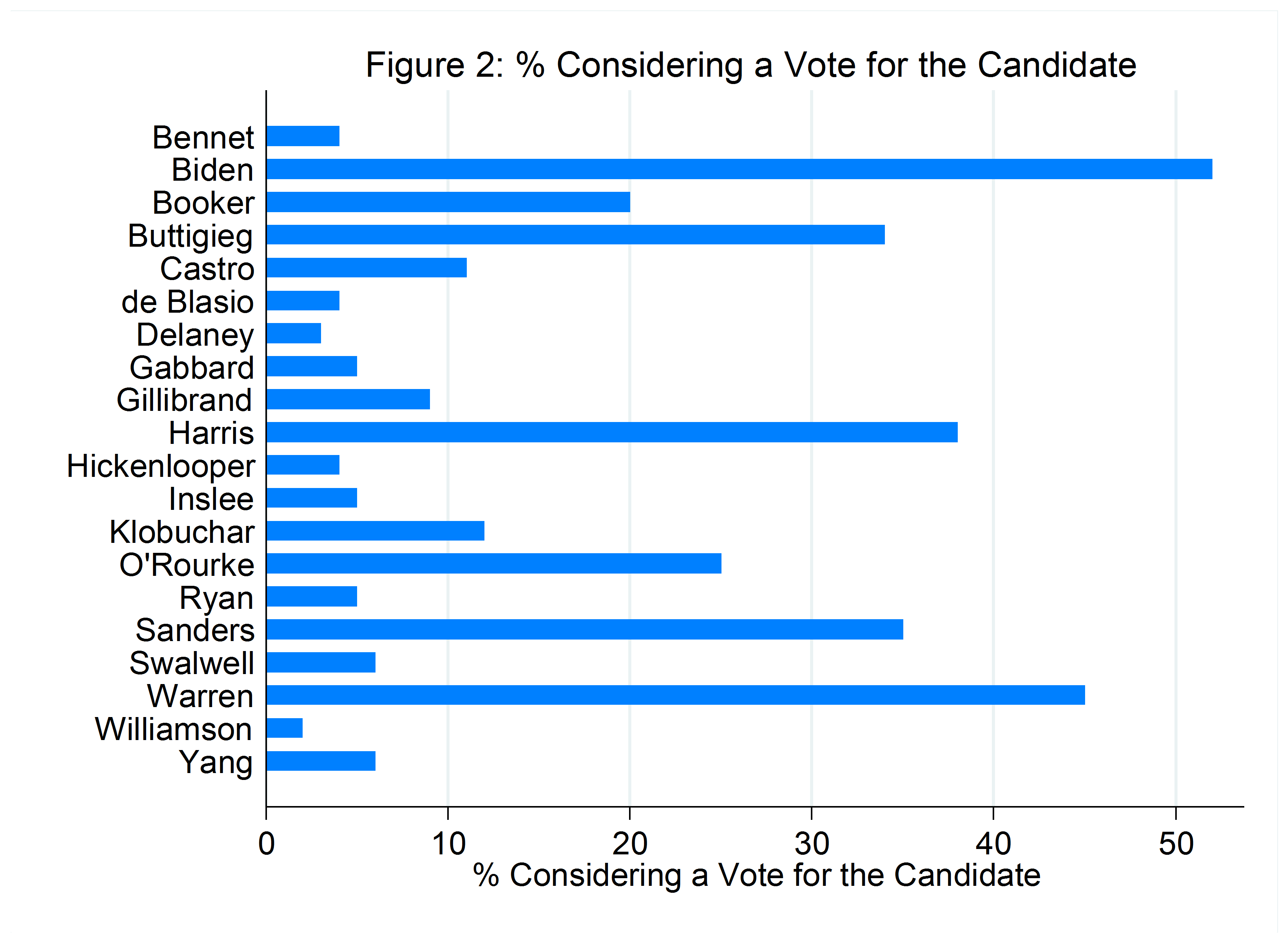 Figure 1 presents the most recent voting intention data collected by the Economist and YouGov—which are comparable to other recent polls. In addition to Bernie Sanders, Biden’s strongest challengers are Senator Elizabeth Warren, Pete Buttigieg (the mayor of South Bend, Indiana), and Senator Kamala Harris. Even if we expand the focus to examine all candidates that Democratic Primary voters are currently considering voting for, Figure 2 reveals that the same four candidates are the leading challengers to Biden’s lead. Two additional candidates—Senator Cory Booker and former Representative Robert ‘Beto’ O’Rourke—emerge as potential rivals. Most, however, have yet to generate much support, and so may need a breakout performance in this first round of debates if they are ever to emerge as serious contenders.