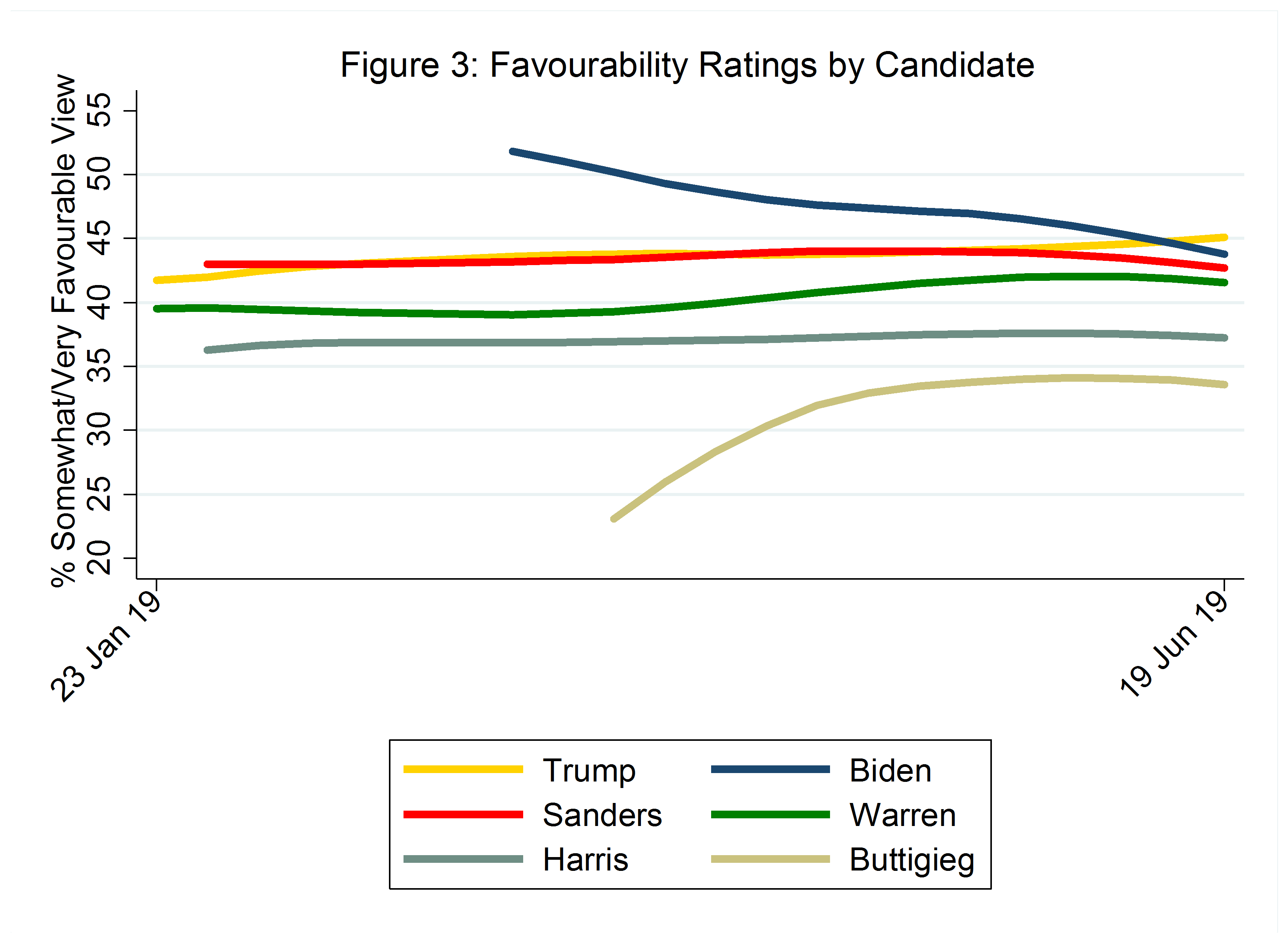 Several recent polls show that many Democratic candidates square up favourably against President Donald Trump in head-to-head matchups. While these early polls suggest more people would vote for Democratic candidates than Trump in a hypothetical election held tomorrow, some caution is warranted, as the depth of support for these candidates may be limited. Looking at the percentages holding favourable ratings of the leading candidates in comparison with the percentage holding a favourable view of Trump in Figure 3, we see that Trump’s favourability ratings are stronger than those of the leading Democratic candidates, including Biden’s—whose favourability ratings used to exceed Trump’s, but have slumped in recent weeks. Although a lot can change between now and November 2020, especially as the share of Americans recognising each Democratic candidate increases, the comparatively low favourability ratings raise concerns about whether voters who are unenthusiastic about Democratic candidates will actually show up to vote.