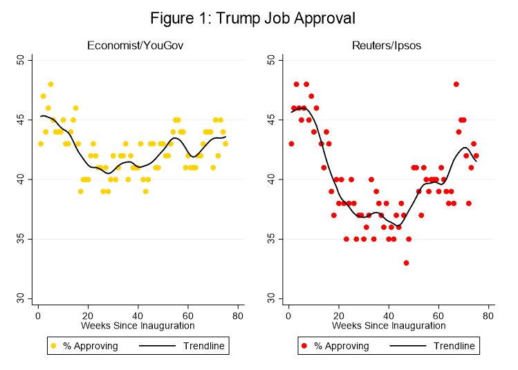 Figure 1 presents data measuring the public’s approval of Trump’s performance since inauguration in 2017 from two weekly polls: those conducted by the Economist/YouGov (examining the views of registered voters) and Reuters/Ipsos (examining all adults’ opinions). Specifically, I present the percentage strongly/somewhat approving of his performance as president in each poll. The Economist/YouGov data show that Trump’s approval remains down on the (modest) levels he enjoyed immediately after his inauguration, but that this percentage may be increasing towards 45 percent approval. While the Reuters/Ipsos data suggest Trump experienced a much steeper drop in approval last summer and autumn than the decline observed in the Economist/YouGov data, a similar upward trend towards 40+ percent approval can be seen in these data as well.