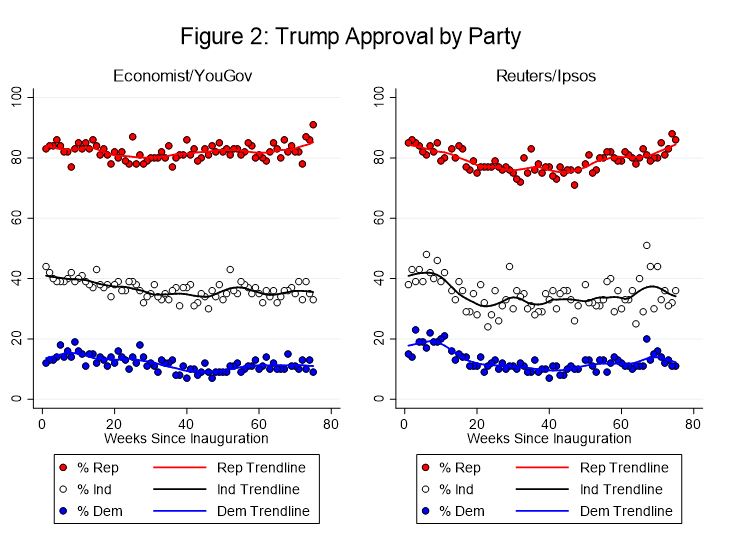 In this polarised age, it should come as no surprise that Trump’s approval ratings break down neatly along partisan lines—as seen in Figure 2. Trump’s approval among Democrats is mirror opposite to the (lack of) approval he enjoys among Republicans, with his approval among Democrats only occasionally flirting with the 20 percent mark, and his approval among Republicans dipping below 80 percent only in the Reuters/Ipsos data during the summer/autumn of 2017. In both polls, Trump’s approval among Republicans has increased beyond 80 percent in recent weeks. Between these two extremes (though closer to Democrats) are Independents, whose approval ratings of Trump have fluctuated around the mid-30s. While this level of approval is historically low, the fact that it remains near the levels seen at the beginning of his presidency suggests we should not be quick to count Trump and the Republicans out.