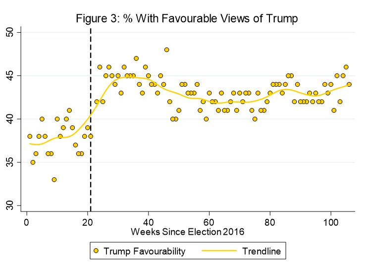 While Trump’s approval ratings remain quite low, it is surprising to learn that the American public today, on average, hold a more favourable view of Trump than they did on the eve of the 2016 election. Using a measure from the Economist/YouGov polls asking respondents about their feelings towards Trump (which permits us to examine attitudes towards Trump prior to becoming president), Figure 3 presents the percentage of registered voters since June 2016 with a favourable/unfavourable view of Trump.