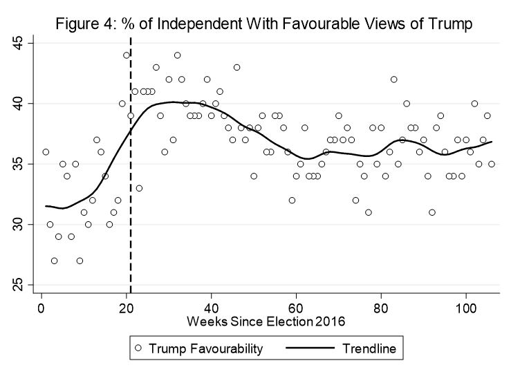 It is important to remember, however, that Trump’s increasing favourability is concentrated primarily among Republicans. Among Independents, the pattern is considerably more volatile. This can be seen in Figure 4, which presents the percentage of Independent respondents to the Economist/YouGov polls with a favourable/highly favourable opinion of Trump. While the percentage of Independents holding a favourable opinion of Trump today is greater than at this point two years ago, this is down on even the modest favourability numbers Trump enjoyed on the eve of the 2016 election.