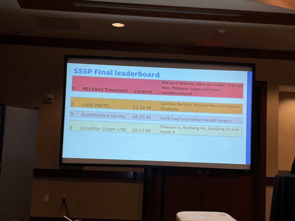 This challenge was hosted by the 30th ACM SIGPLAN Annual Symposium on Principles and Practice of Parallel Programming (PPoPP 2025). Our solution, “Relax and don’t Stop: Graph-aware Asynchronous SSSP,” managed to process 150.89 million edges per second, significantly outperforming the second-best solution, achieving a 3 times speedup over it.