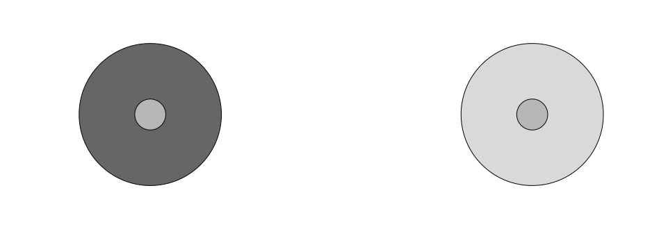 The last illusion we are going to present is usually referred to as brightness contrast and is illustrated in Figure 7. Despite the two inner circles having the same brightness, the one surrounded by the darker circle appears brighter. This effect is caused by our vision system being sensitive to relative intensities and is key to let us see in different lighting conditions.