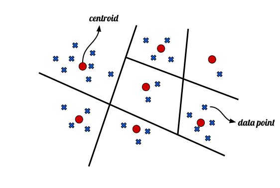 Fig. 1 – Example of data space partition. Each data point (blue crosses) belongs to a region, represented by a centroid (red dots).