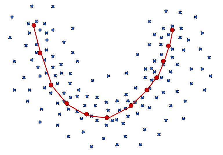Figure 2 displays a schematic example of how a 1D SOM algorithm might look like on a 2D space.