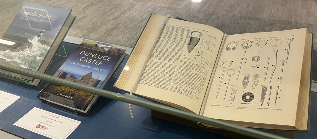 The collection also includes a wide range of archaeological surveys. These function as detailed records of archaeological discovery within specific geographical areas and represent a valuable resource to both researchers and casual readers alike. Currently on display are surveys of County Down, Rathlin Island, and Strangford Lough.