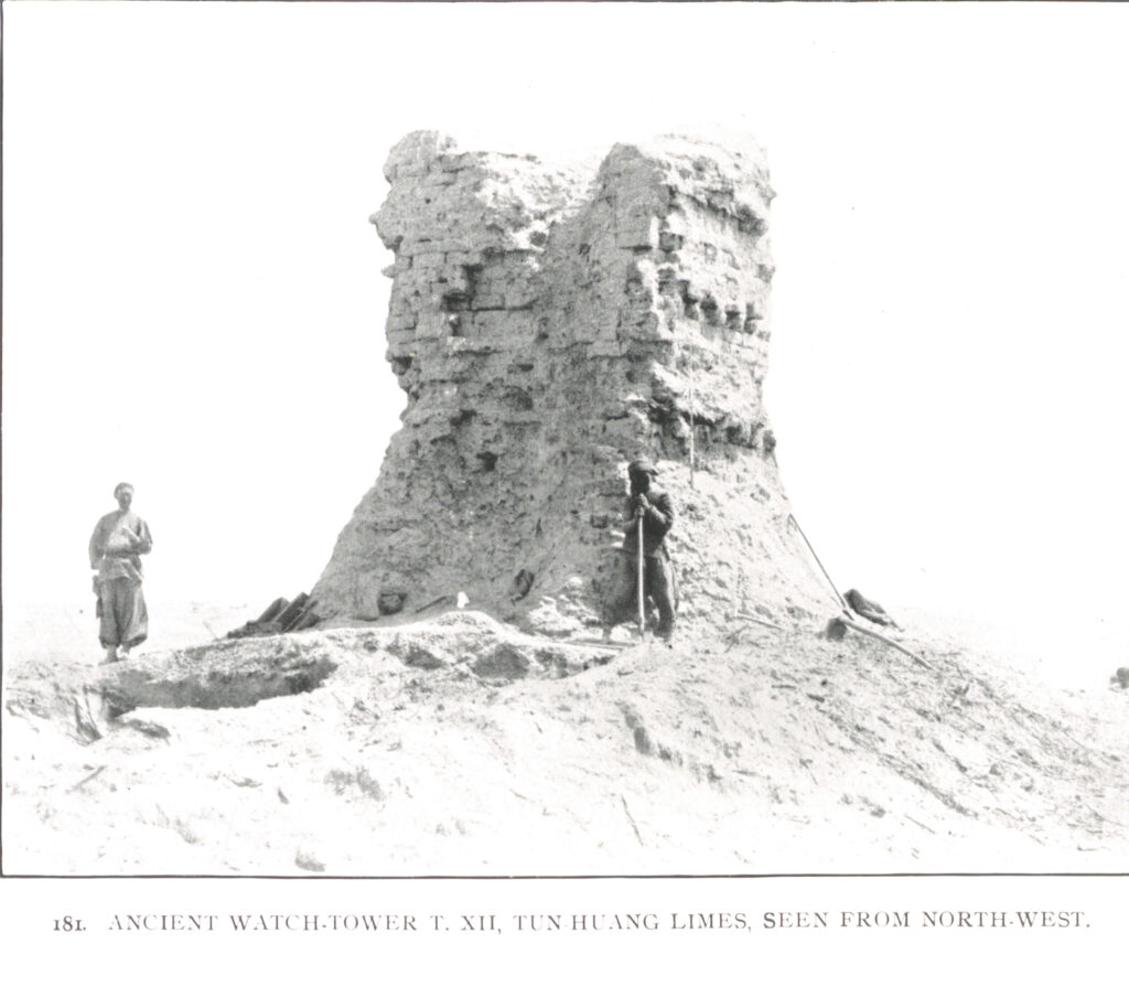 Ancient fort T. XIV, at ‘Jade Gate’ of Tun-Huang Limes, with gate through west wall. From Serindia, p. 685Ancient watch-tower T. XII, Tun Huang Limes, seen from north-west. From Serindia, p. 685Ancient fort T. XIV, at ‘Jade Gate’ of Tun-Huang Limes, seen from north-east. From Serindia, p. 685North-west corner of enclosure of Ancient Magazine T. XVIII, Tun-Huang Limes, with refuse heap in course of clearing. From Serindia, p. 685